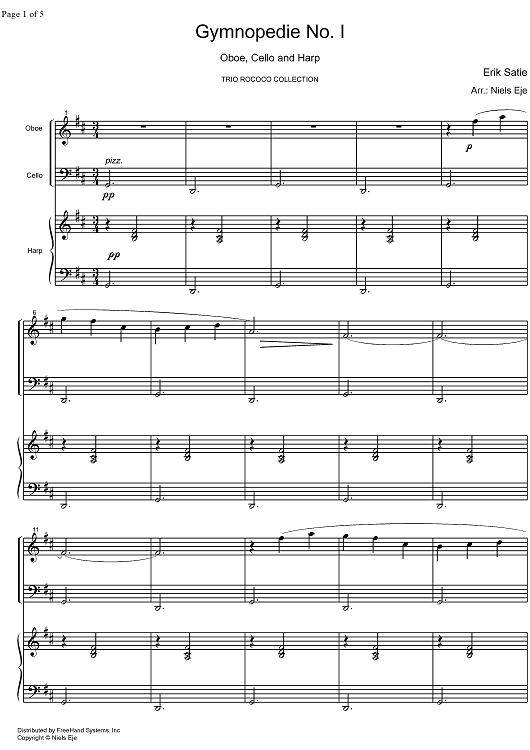 Digital Sheet Music for Gymnopedie No. 1 - Score by Niels Eje, Erik Satie scored for Oboe/Cello/Harp; id:324714