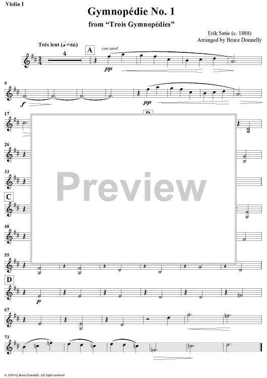 Digital Sheet Music for Gymnopédie No. 1 - Violin 1 by , Bruce Donnelly, Erik Satie scored for String Quartet; id:359780