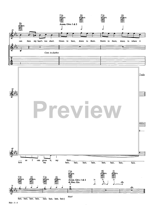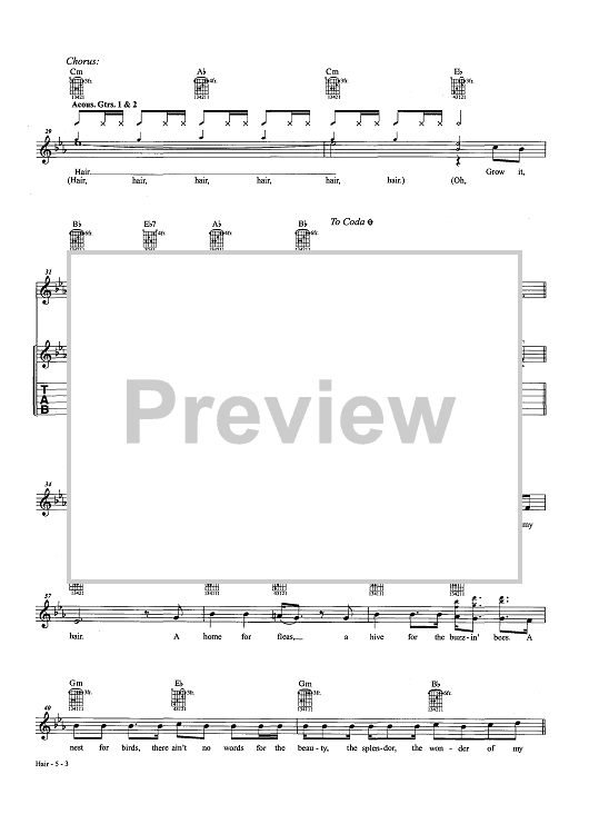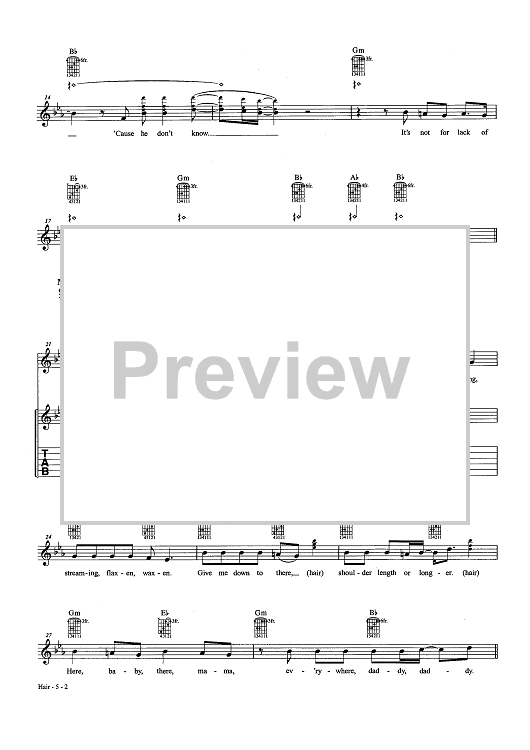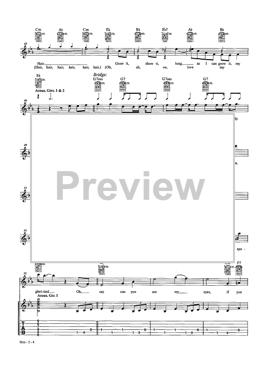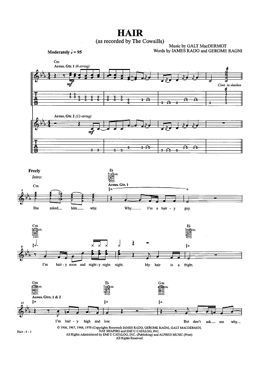 Digital Sheet Music for Hair (as recorded by The Cowsills) by Galt MacDermot, James Rado, Gerome Ragni, The Cowsills scored for Easy Guitar Tab/Vocal/Chords; id:457217