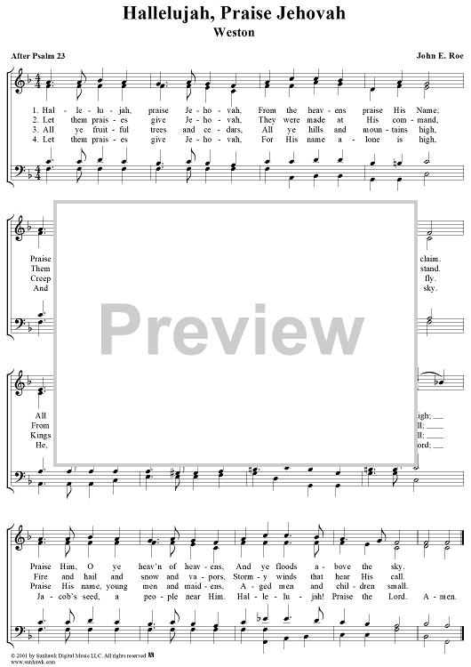 Digital Sheet Music for Hallelujah, Praise Jehovah by J. E. Roe scored for Four-part Mixed Chorus; id:269253