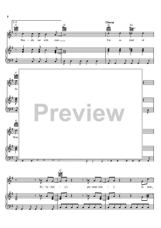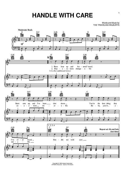 Digital Sheet Music for Handle With Care by Roy Orbison, Bob Dylan, George Harrison, Tom Petty, Jeff Lynne, The Traveling Wilburys scored for Piano/Vocal/Chords; id:402439