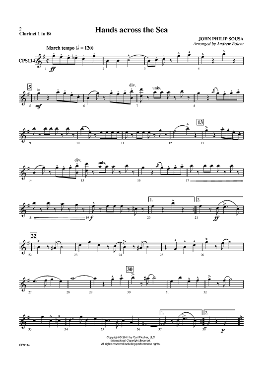 Digital Sheet Music for Hands Across The Sea (March) - Clarinet 1 in Bb by John Philip Sousa, Andrew Balent scored for Concert Band; id:420131