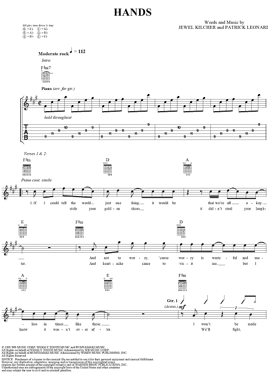 Digital Sheet Music for Hands by Jewel, Patrick Leonard scored for Guitar Tab/Vocal; id:118994