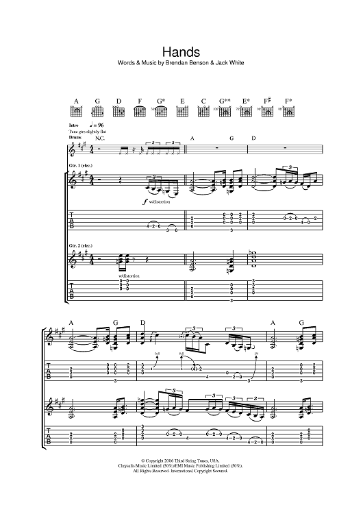 Digital Sheet Music for Hands by Brendan Benson, The Raconteurs, Jack White scored for Guitar Tab; id:394091