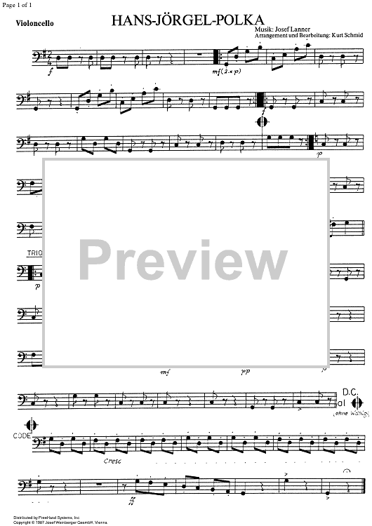 "Hans Jörgel Polka Op.194 - Cello" Sheet Music by Josef Lanner