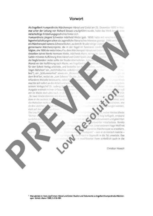 When Engelbert Humperdinck’s fairy tale opera Hänsel und Gretel was premiered on 23 December 1893 in Weimar conducted by Richard Strauss, the work could look back on an extensive history of origin.Humperdinck’s younger sister Adelheid Wette (born in 1858) had displayed a great interest in literature in her youth and written a variety of poems for special occasions. In 1888, she wrote a fairy tale entitled Schneewittchen [Snow White] and her brother supplied some songs for this piece. Further fairy tale collaborations followed which were customarily performed within the family circle, and the first draft of the Hänsel und Gretel was begun in 1890. Adelheid’s husband would be celebrating his 34th birthday on 16 May of this year and his wife intended to surprise him with a performance of her version of this fairy tale. Her brother was allotted the task of composing the accompanying songs and, a month before the birthday, she wrote a letter to him in Mainz where Engelbert Humperdinck was among other activities working as an editor for the Schott publishing house, ordering a “very pretty folkloric” Tanzlied [Dance song], a Waldlied [Forest song] (or Echolied [Echo song]), a Schlummerlied [Lullaby] and a Kickericki-Lied [Cock-a-doodle-doo song] from her “dear sugar-sweet little brother... Engel-Bärtchen [angel beard]”. She enclosed the corresponding verses with the letter and “for fun” also provided her own invented melody for the Schlummerlied and rhythmic suggestions for the Tanzlied. Humperdinck went straight to work and, as related in an entry in his diary, was already able to play the songs to the director of the publishing house, Dr Ludwig Strecker, by 19 April.This was the history of origin of the four songs published for the first time edited in form of their original versions in this edition Brüderchen komm’ tanz’ mit mir, Wer ruft mir im Walde doch alles nach, In den Zweigen die Vögelein und Tirelireli! ‘s ist nicht mehr früh “for two children’s voices and piano