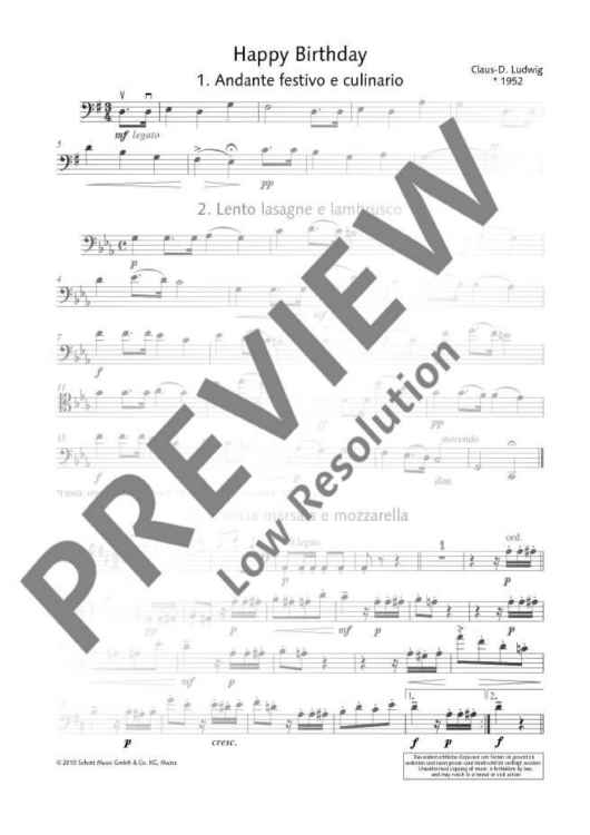 Well-known and generally popular - that's what the Happy Birthday meals served by Claus-Dieter Ludwig are. Meanwhile, they are available for various instrumentations (for piano solo and piano duet, for accordion duo, string quartet and piano trio, wind trio). Now, it's the cellists' turn to be invited to the buffet - we beg your pardon, to come into their own as gourmets! Enjoy 'Andante festivo e culinario', 'Lento lasagne e lambrusco', 'Marcia marsala e mozzarella', 'Valzero vongole e vaniglia' and the crowning dessert, a fiery 'Tango tartufo e tagliatelle'!