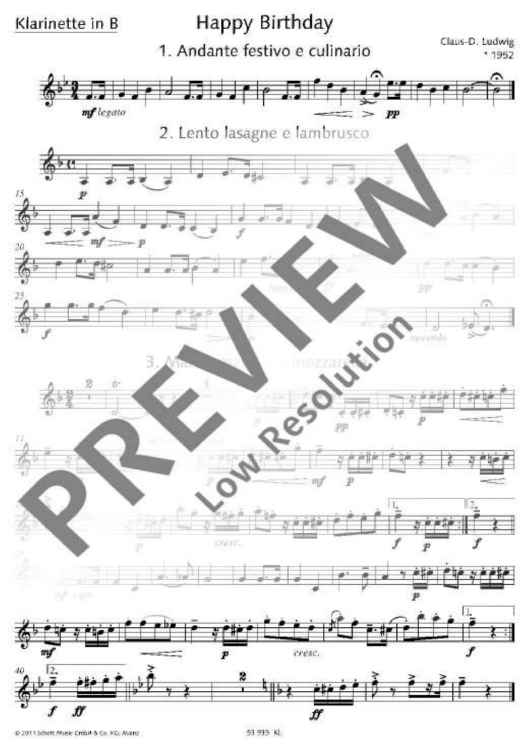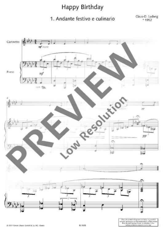Most well-known and generally popular - that's what the Happy Birthday meals served by Claus-Dieter Ludwig are. Meanwhile, they are available in various instrumentations (for violin and piano, piano solo and piano duet, accordion duo, string quartet, piano trio, wind trio, etc.). Now, it's the clarinettists' turn to be invited to the buffet – we beg your pardon, to come into their own as gourmets! Enjoy five entertaining variations on the famous birthday song: 'Andante festivo e culinario', 'Lento lasagne e lambrusco', 'Marcia marsala e mozzarella', 'Valzero vongole e vaniglia', and the crowning dessert, 'Czárdás ciabatta e cioccolata'! A rewarding encore piece that should be a delight to the performers and audience alike.