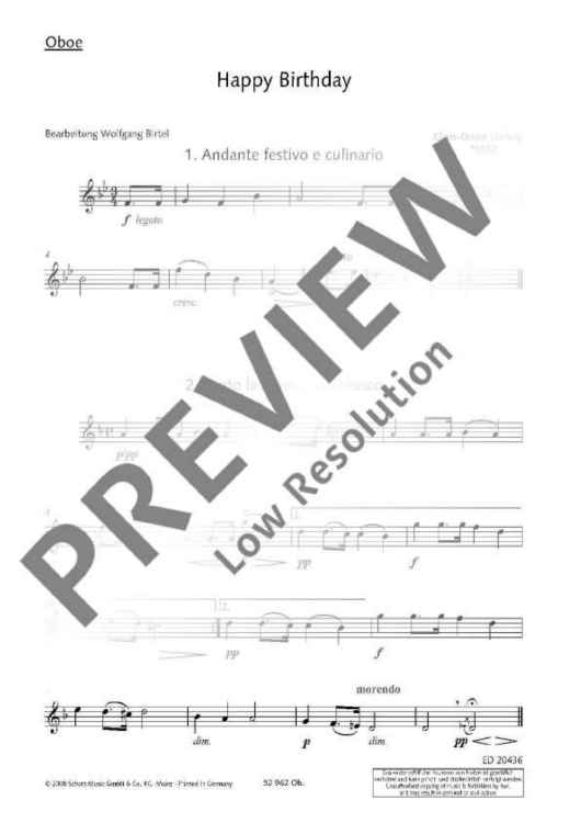 Most well-known and generally popular - that's what the Happy Birthday meals served by Claus-Dieter Ludwig are. Meanwhile, they are available in various instrumentations (for piano solo and piano duet, for accordion duo, string quartet and piano trio). Now, the work has been rearranged by Wolfgang Birtel – and the wind instruments are finally invited to the buffet! The classic trio d'anches with oboe, clarinet and bassoon deals with the epicurean delights of Happy Birthday in five courses to which other music titles have been added as well. Enjoy 'Andante festivo e culinario', 'Lento lasagne e lambrusco', 'Marcia marsala e mozzarella', 'Valzero vongole e vaniglia' and the crowning dessert, a fiery 'Tango tartufo e tagliatelle'!