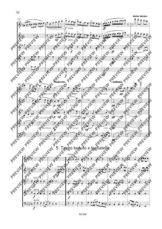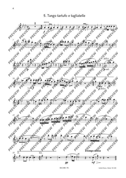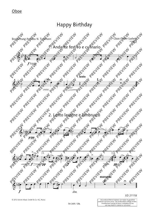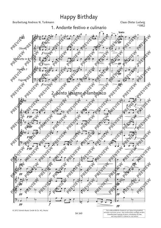 Most well-known and generally popular - that's what the Happy Birthday meals served by Claus-Dieter Ludwig are. Meanwhile, they are available in various instrumentations (for piano solo and piano duet, accordion duo, string quartet, piano trio). Now, Andreas Tarkmann has rearranged the work, and it's the wind instrument players' turn to be invited to the buffet – we beg your pardon, to come into their own as gourmets! Flute, oboe, clarinet, horn and bassoon enjoy five entertaining variations on the famous birthday song into which other music titles have been sneaked as well: 'Andante festivo e culinario', 'Lento lasagne e lambrusco', 'Marcia marsala e mozzarella', 'Valzero vongole e vaniglia', and the crowning dessert, a fiery 'Tango tartufo e tagliatelle'!