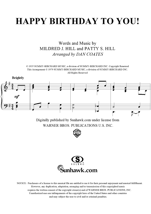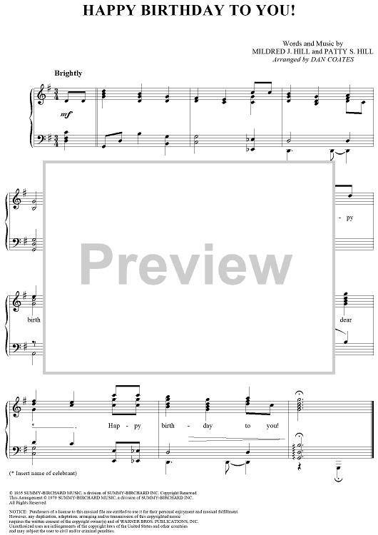 Digital Sheet Music for Happy Birthday to You! by Dan Coates, Mildred J. Hill, Patty S. Hill scored for Piano/Vocal; id:266532