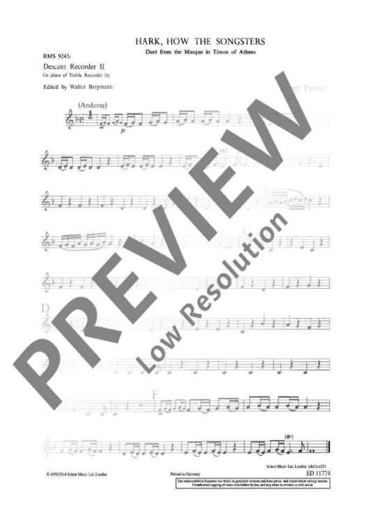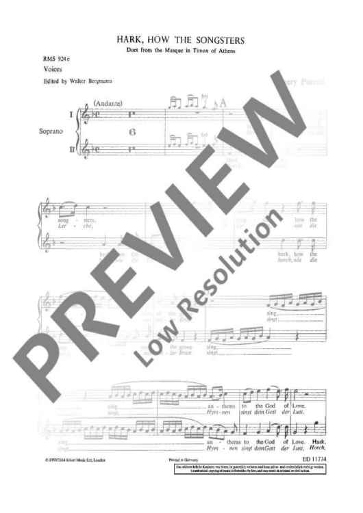 "Hark, how the songsters - Score and Parts" Sheet Music by Henry Purcell