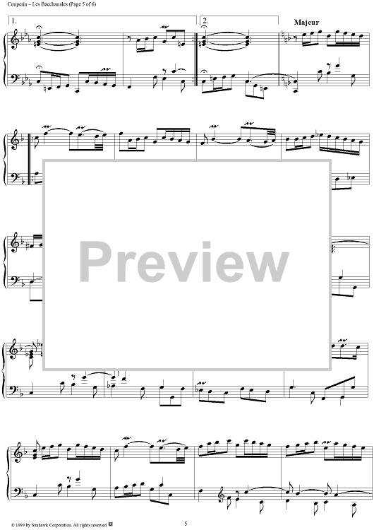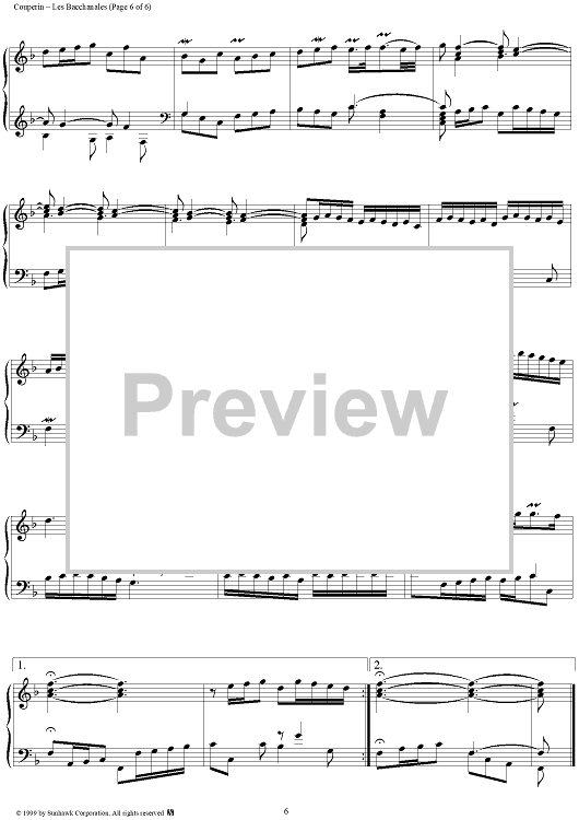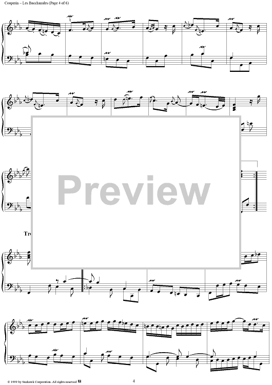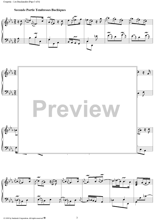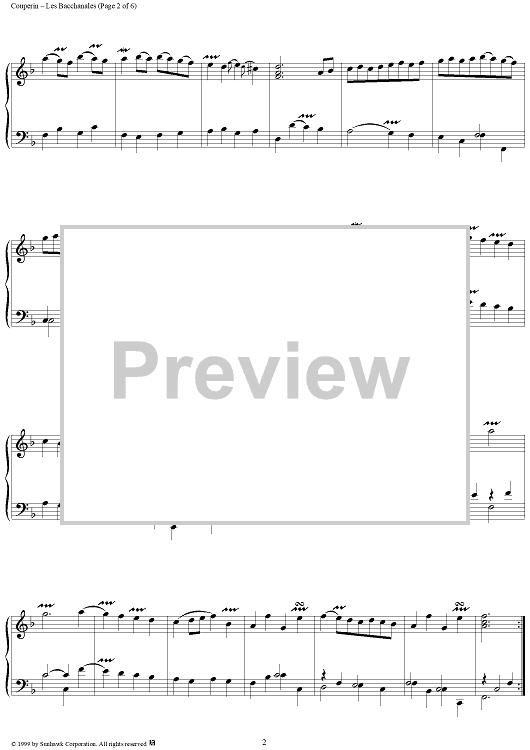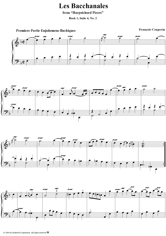 Digital Sheet Music for Harpsichord Pieces, Book 1, Suite 4, No.2: Les Bacchanales 1. Premiere Partie Enjouemens Bachiques, 2. Second Partie Tendresses Bachiques, 3. Troisieme et Derniere Partie Des Bacchanales Fureurs Bachique. by Francois Couperin scored for Piano Solo; id:272300