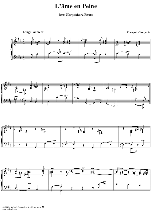 Digital Sheet Music for Harpsichord Pieces, Book 3, Suite 13, No. 5: L'âme en peine by Francois Couperin scored for Piano Solo; id:272649