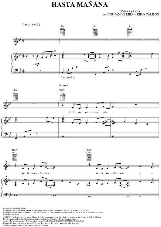 Digital Sheet Music for Hasta Mañana by Grupo Limite, Fernando Riba, Kiko Campos scored for Piano/Vocal/Chords; id:203681