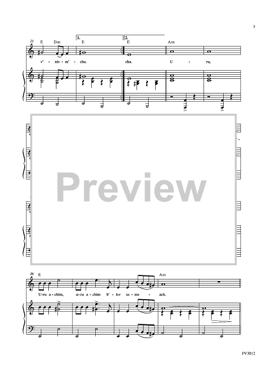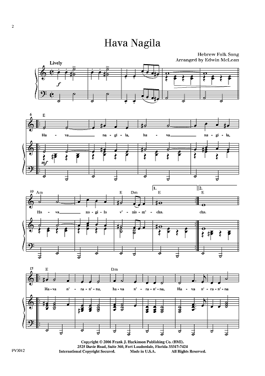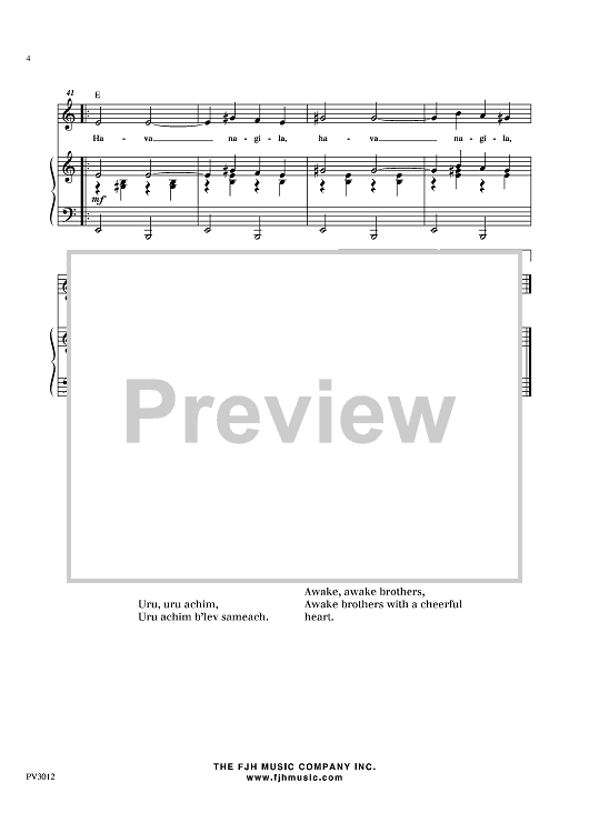 This lively traditional Hebrew folk song arranged for voice and piano, includes the traditional Hebrew lyrics as well as the English translations. The piano part is arranged to fully support the vocal part as well as stand on it's own as an instrumental solo if desired. Chord symbols are provided on top of the vocal line to facilitate possible variations in accompaniment patterns, or use of additional instruments.