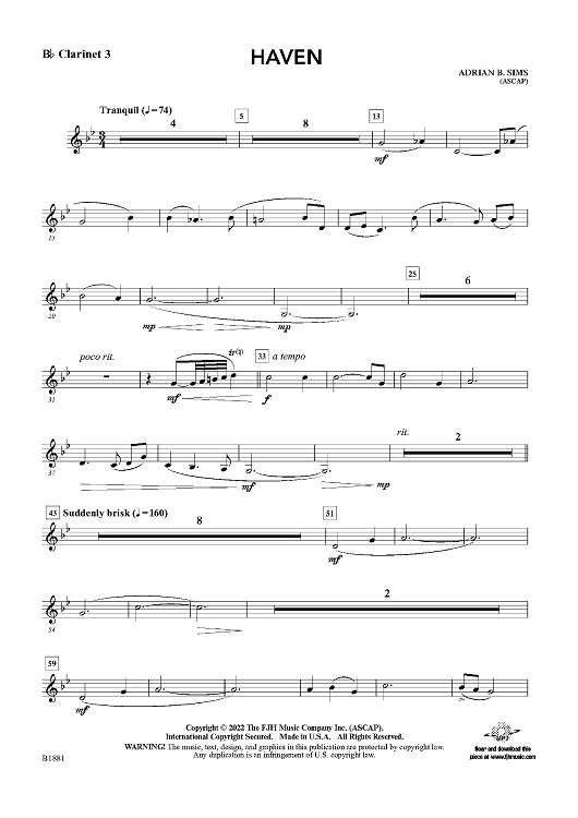 "Haven - Bb Clarinet 3" Sheet Music by Adrian B. Sims