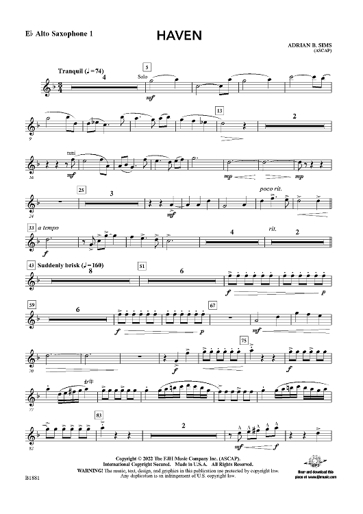 Digital Sheet Music for Haven - Eb Alto Sax 1 by Adrian B. Sims scored for Concert Band; id:498869