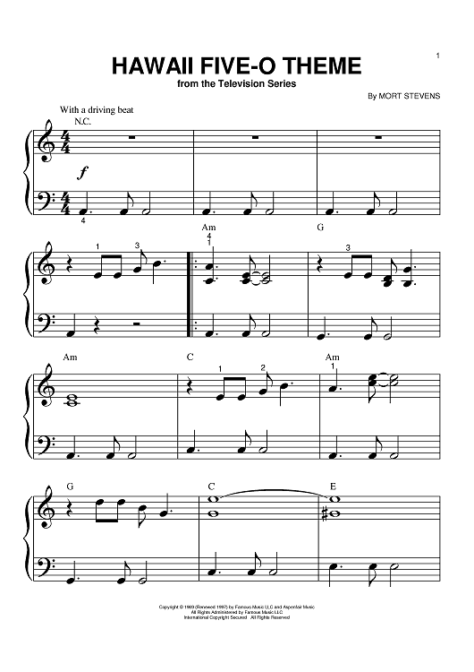 Digital Sheet Music for Hawaii Five-O Theme by The Ventures, Mort Stevens scored for Big Note Piano; id:389722