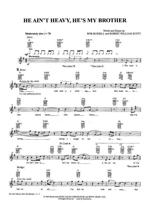 "He Ain't Heavy, He's My Brother" Sheet Music by The Hollies