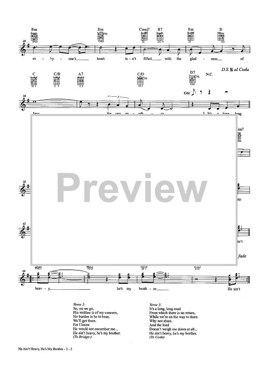 Digital Sheet Music for He Ain't Heavy, He's My Brother by Bob Russell, The Hollies, Robert Scott scored for Easy Guitar Tab/Vocal/Chords; id:457223