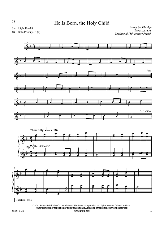 Digital Sheet Music for He Is Born, the Holy Child by Traditional French Melody, James Southbridge scored for Organ Solo; id:434671