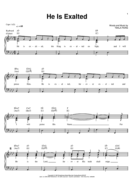 Digital Sheet Music for He Is Exalted by Twila Paris scored for Piano/Vocal/Chords; id:393820