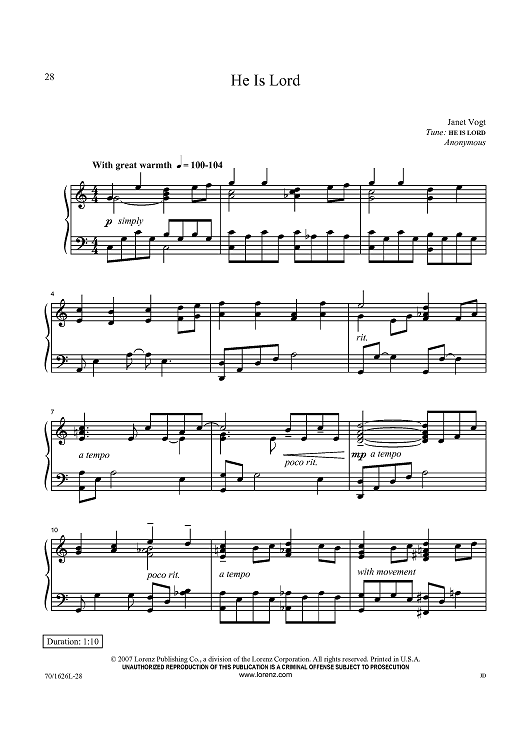 Digital Sheet Music for He is Lord by Anonymous, Janet Vogt scored for Piano Solo; id:433889