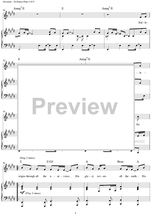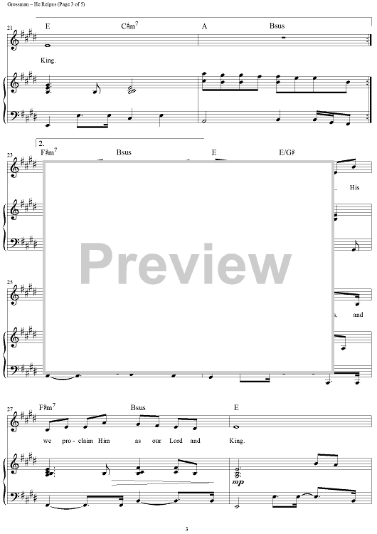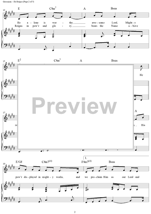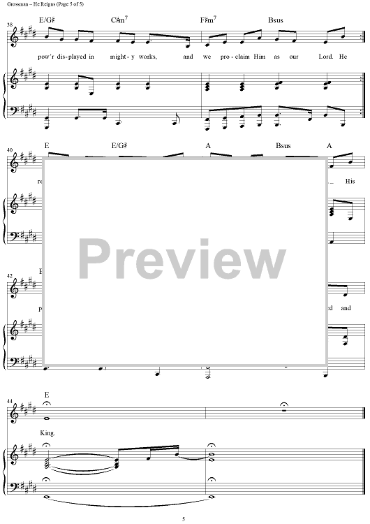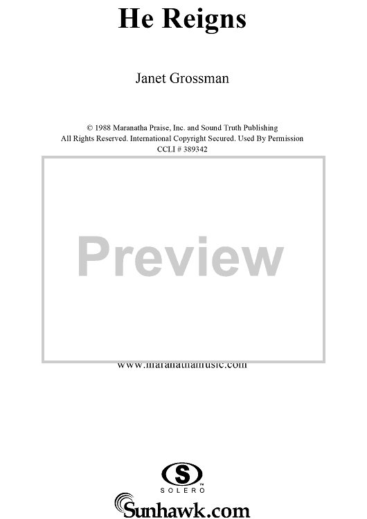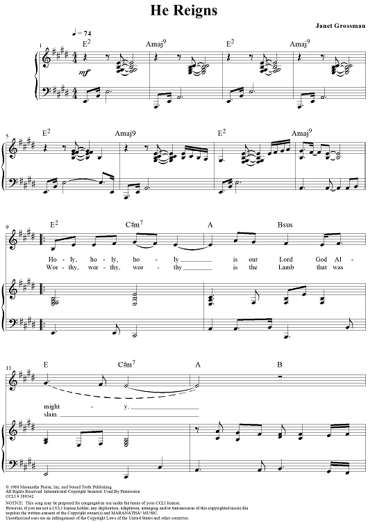 Digital Sheet Music for He Reigns by Janet Grossman scored for Piano/Vocal/Chords; id:220599