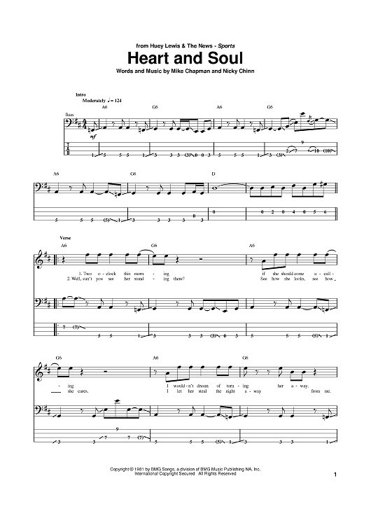 Digital Sheet Music for Heart And Soul by Mike Chapman, Nicky Chinn, Huey Lewis & The News scored for Bass Tab; id:383060