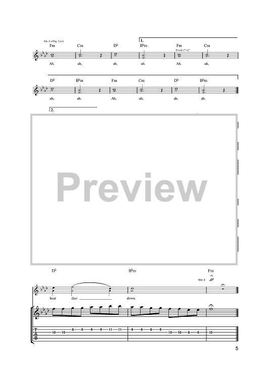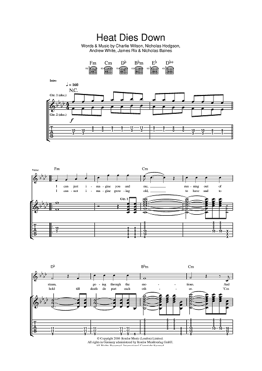 Digital Sheet Music for Heat Dies Down by Nick Baines, Nick Hodgson, Kaiser Chiefs, Simon Rix, Andrew White, Charlie Wilson scored for Guitar Tab; id:397024