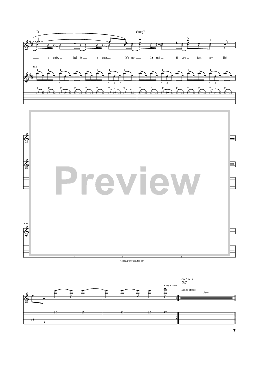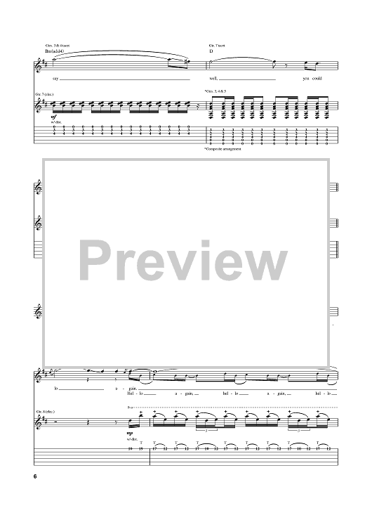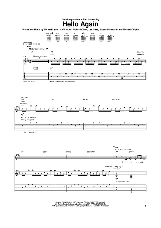 Digital Sheet Music for Hello Again by Michael Lewis, Lostprophets, Richard Oliver, Ian Watkins scored for Guitar Tab; id:374978