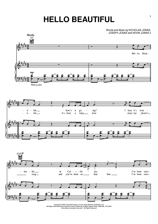 Digital Sheet Music for Hello Beautiful by Nicholas Jonas, Joseph Jonas, Kevin Jonas II, Jonas Brothers scored for Piano/Vocal/Chords; id:402229