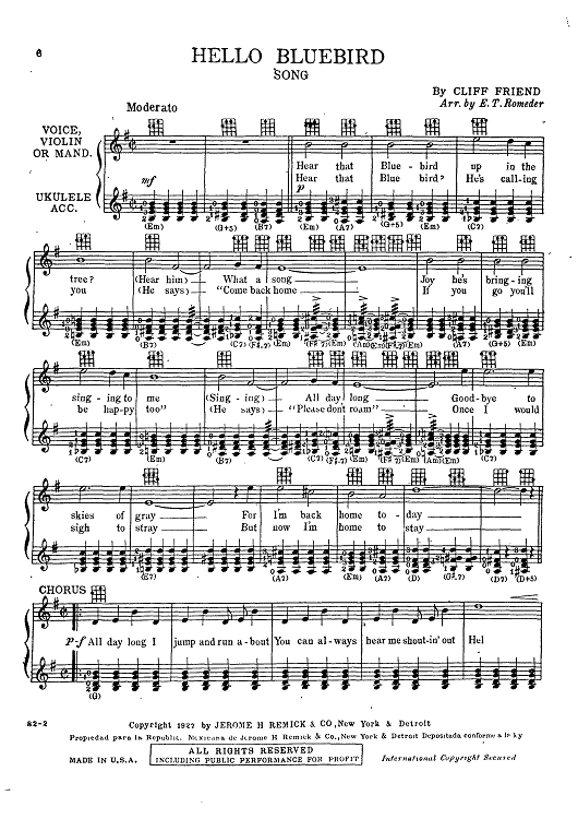 Digital Sheet Music for Hello Bluebird by , Cliff Friend, E. T. Romeder scored for Ukulele; id:418685