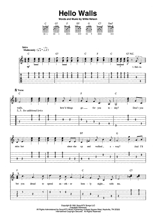 Digital Sheet Music for Hello Walls by Willie Nelson scored for Easy Guitar Tab/Vocal; id:393009