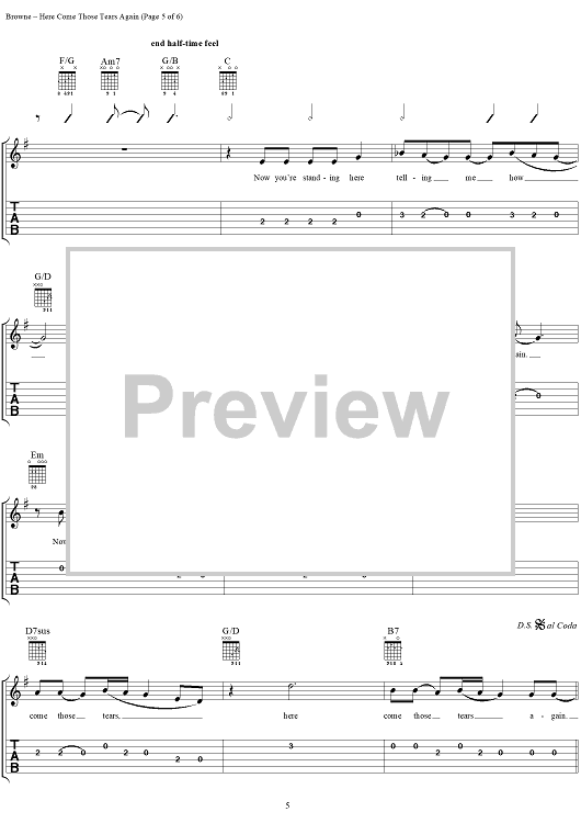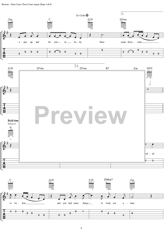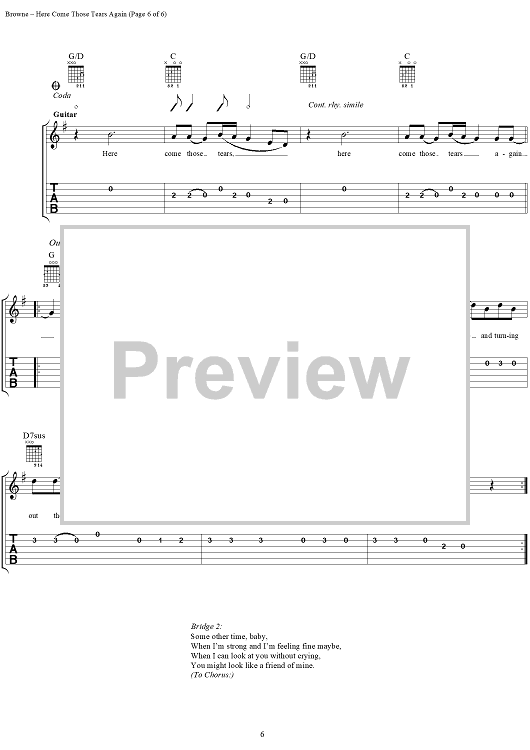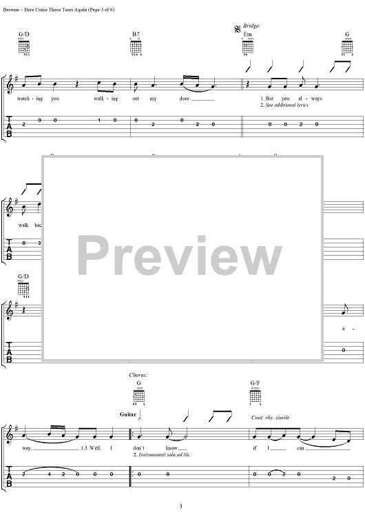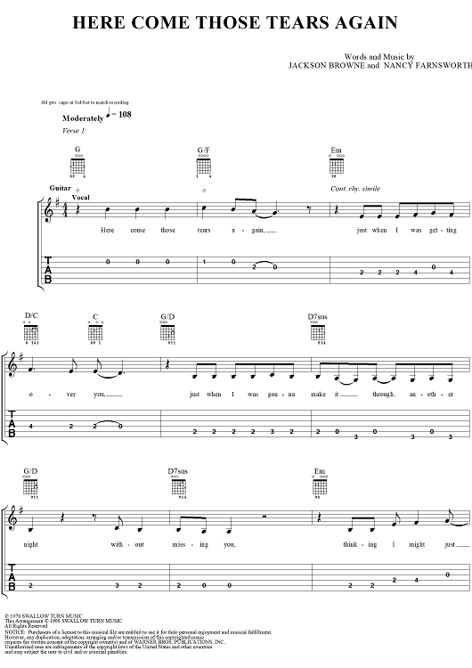 Digital Sheet Music for Here Come Those Tears Again by Jackson Browne, Louis Martinez, Nancy Farnsworth scored for Easy Guitar Tab/Vocal; id:274263