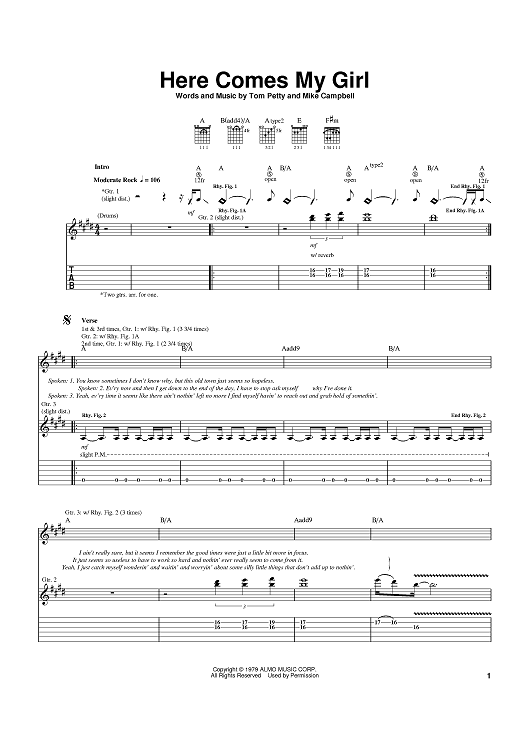 Digital Sheet Music for Here Comes My Girl by Tom Petty, Mike Campbell scored for Guitar Tab; id:370696
