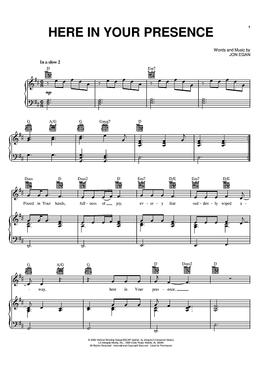 Digital Sheet Music for Here In Your Presence by Jon Egan, New Life Worship scored for Piano/Vocal/Chords; id:401700
