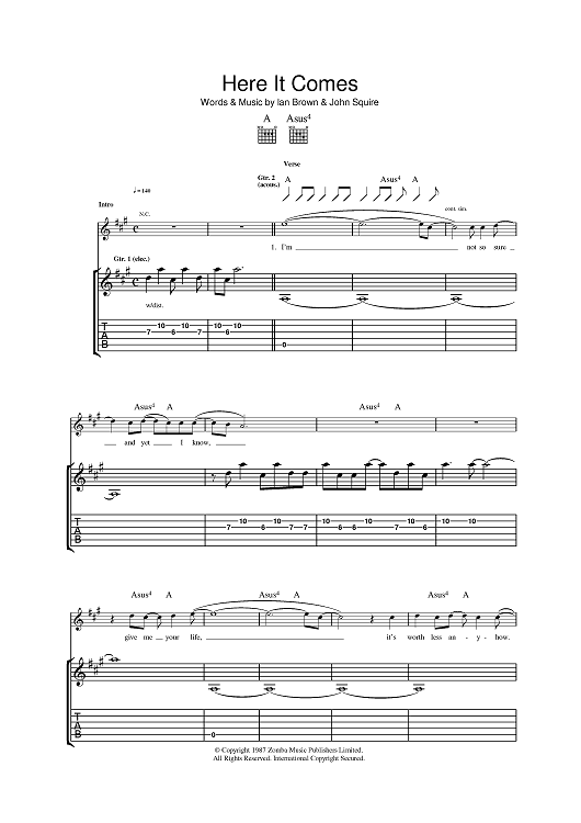 Digital Sheet Music for Here It Comes by Ian Brown, John Squire, The Stone Roses scored for Guitar Tab; id:396198
