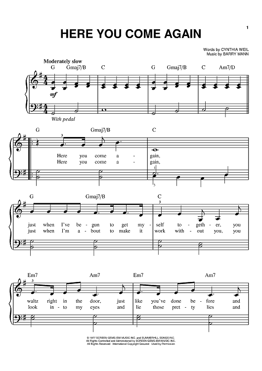Digital Sheet Music for Here You Come Again by Barry Mann, Cynthia Weil, Dolly Parton scored for Easy Piano; id:367404