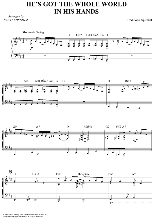 Digital Sheet Music for He's Got The Whole World In His Hands by Traditional Spiritual, Brent Edstrom scored for Piano Solo; id:462479