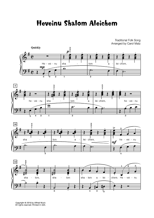 Digital Sheet Music for Heveinu Shalom Aleichem by Carol Matz, Traditional Folk Song scored for Piano; id:461314