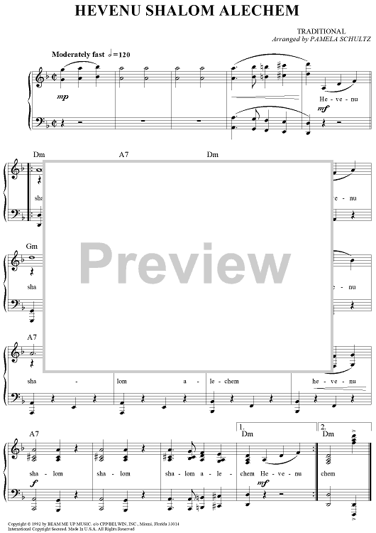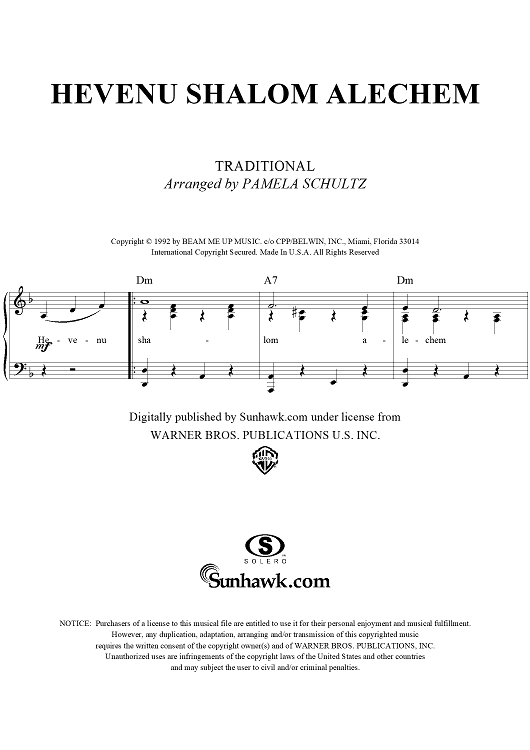 Digital Sheet Music for Hevenu Shalom Alechem by Pamela Schultz, Traditional scored for Piano/Vocal/Chords; id:260870