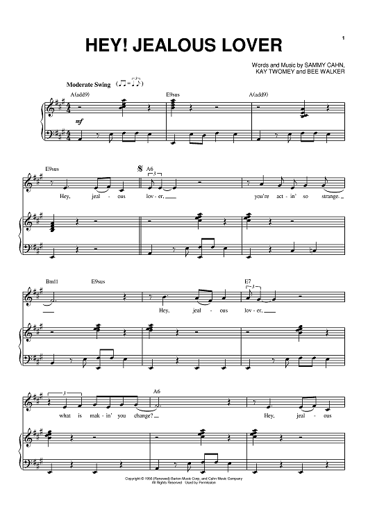 Digital Sheet Music for Hey! Jealous Lover by Frank Sinatra, Sammy Cahn, Kay Twomey, Bee Walker scored for Piano/Vocal/Chords; id:390400