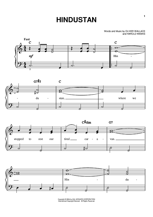 Digital Sheet Music for Hindustan by Artie Shaw, Rosemary Clooney, Oliver Wallace, Harold Weeks scored for Easy Piano; id:373812