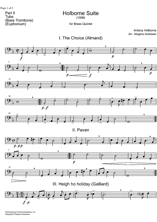 Digital Sheet Music for Holborne Suite - Tuba by Mogens Andresen, Antony Holborne scored for Brass Quintet; id:326908