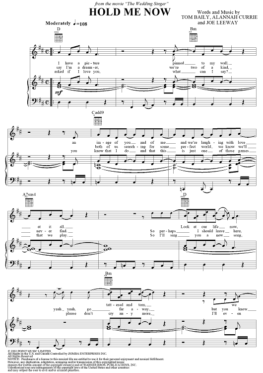 Digital Sheet Music for Hold Me Now by Alannah Currie, Joe Leeway, The Thompson Twins, Tom Bailey scored for Piano/Vocal/Chords; id:112246