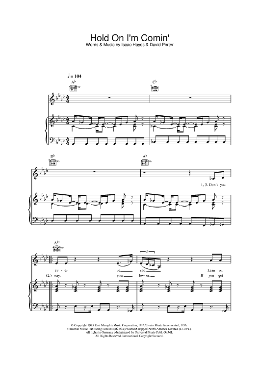 Digital Sheet Music for Hold On I'm Comin' by Isaac Hayes, David Porter, Sam & Dave scored for Piano/Vocal/Chords; id:398688