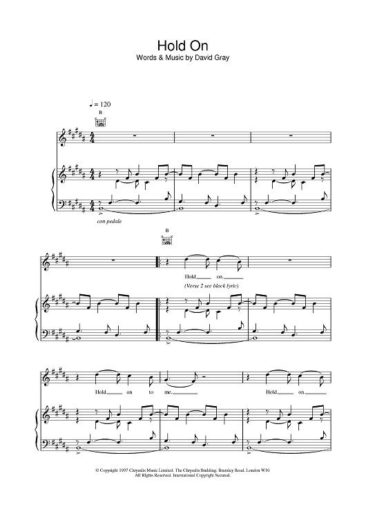 Digital Sheet Music for Hold On by David Gray scored for Piano/Vocal/Chords; id:380022