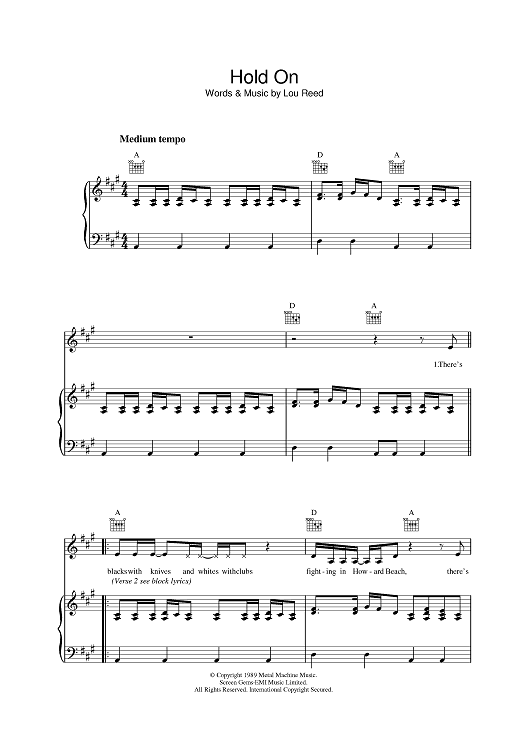 Digital Sheet Music for Hold On by Lou Reed scored for Piano/Vocal/Chords; id:402216